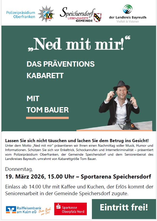 Unter dem Motto „Ned mit mir!“ erwartet Sie ein informativer und unterhaltsamer Nachmittag rund um das Thema Prävention. Die Veranstaltung wird präsentiert vom Polizeipräsidium Oberfranken, dem Seniorenbeirat des Landkreises Bayreuth, der Gemeinde Speichersdorf sowie dem Kabarettisten Tom Bauer.
